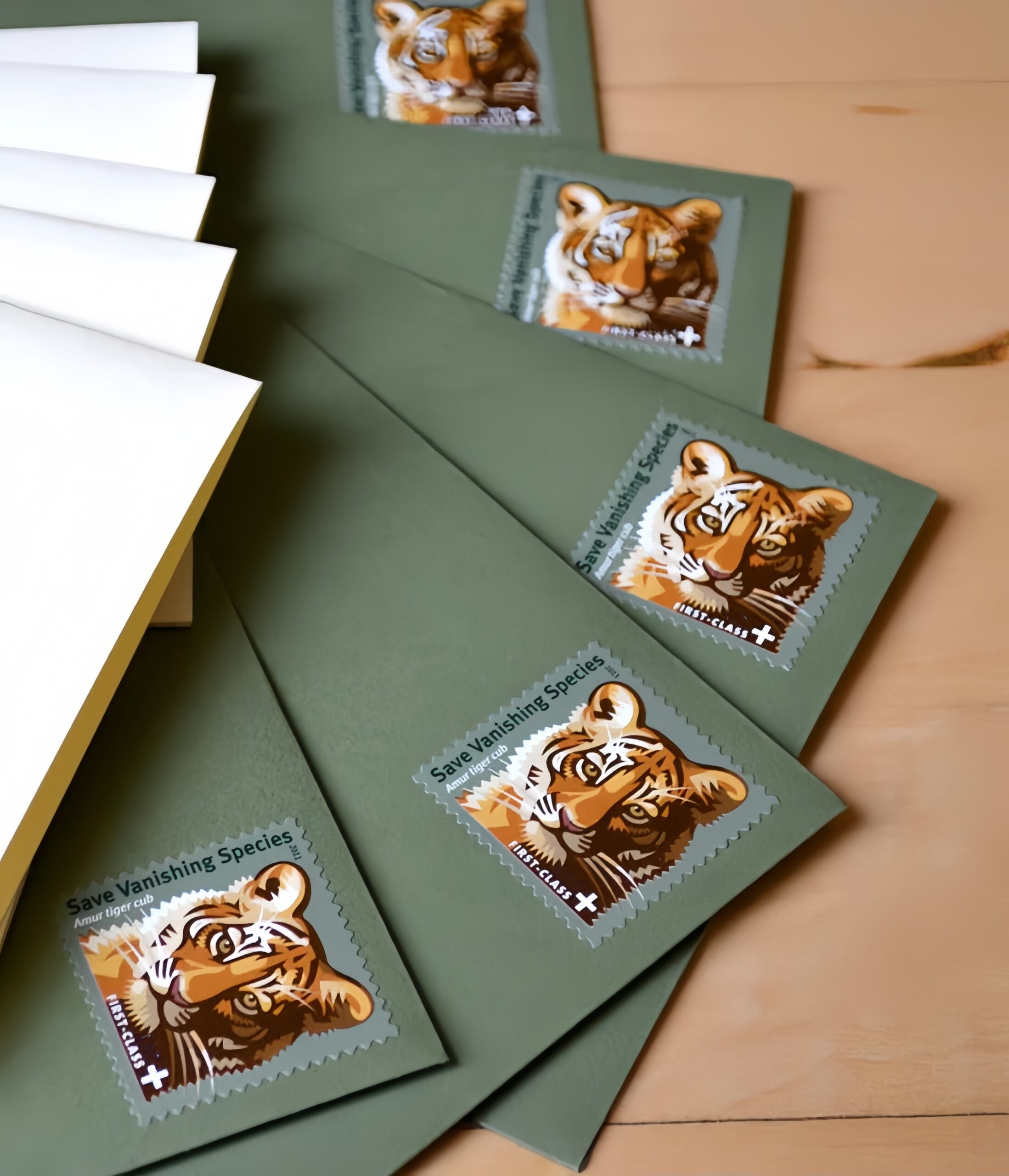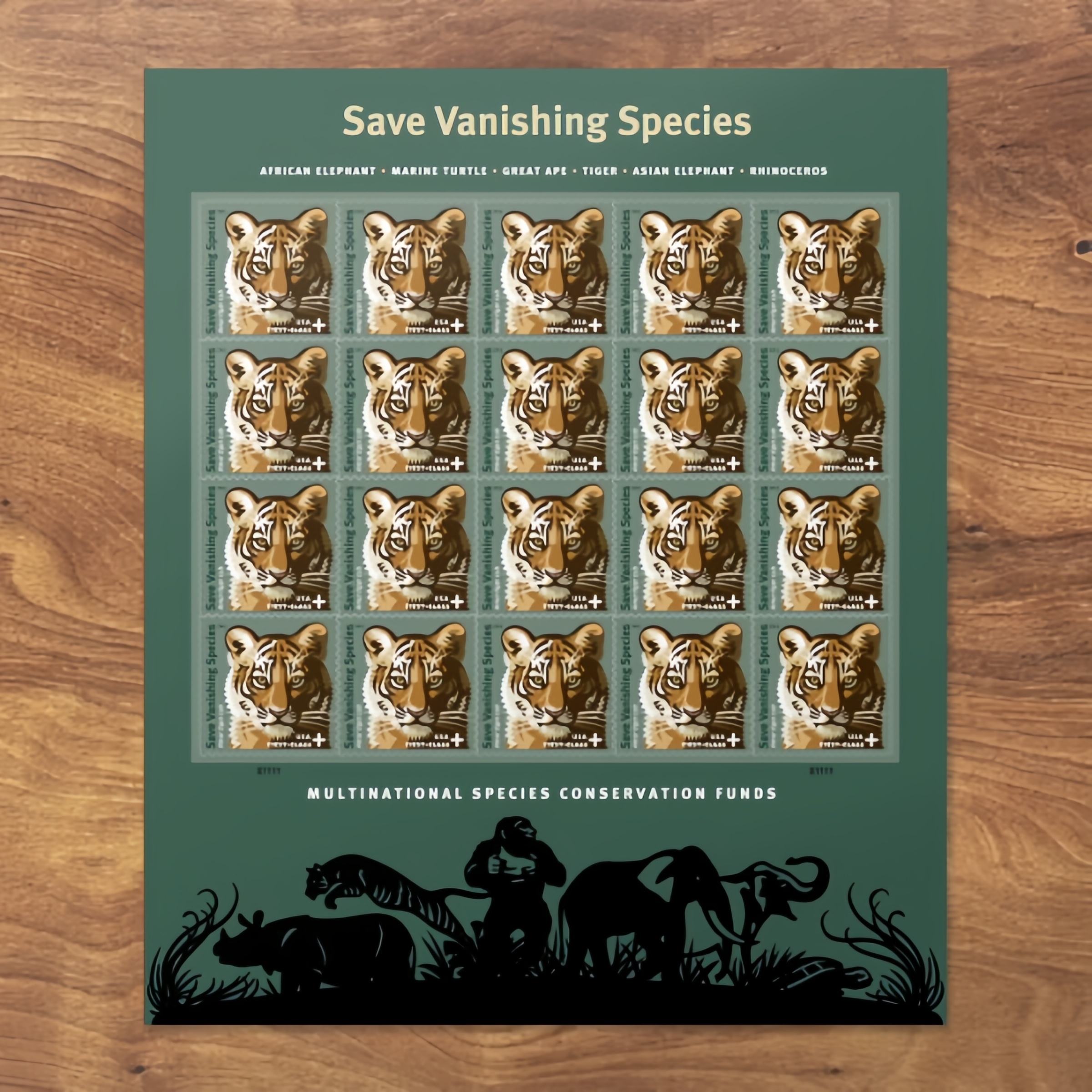 Featuring a bold graphic of an Amur tiger cub, the artwork of the Save Vanishing Species” First-Class Semipostal stamp depictsjust one of the magnificent animals that it is designed to help. Your purchase benefits conservation funds that are helping createhope for the future. Over $6.4 million has been raised for the cause.