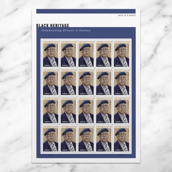 The 46th stamp in the Black Heritage series honors author Ernest J. Gaines (1933-2019). Best known for such novels as TheAutobiography of Miss Jane Pitman and A Lesson Before Dying, Gaines drew from his childhood as the son of sharecroppers on aLouisiana plantation to explore the untold stories of rural African Americans.