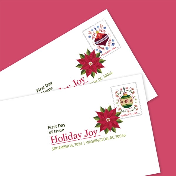 Share whimsical holiday greetings with Holiday Joy stamps from the U.S. Postal Service@.These festive stamps inspired by folk art create a modern graphic look, The 4 designs feature 2 traditionally shaped ornamentsready to hang; a vibrant poinsettia surrounded by greenery; and a blue flower centered against green leaves and delicatescrollwork.